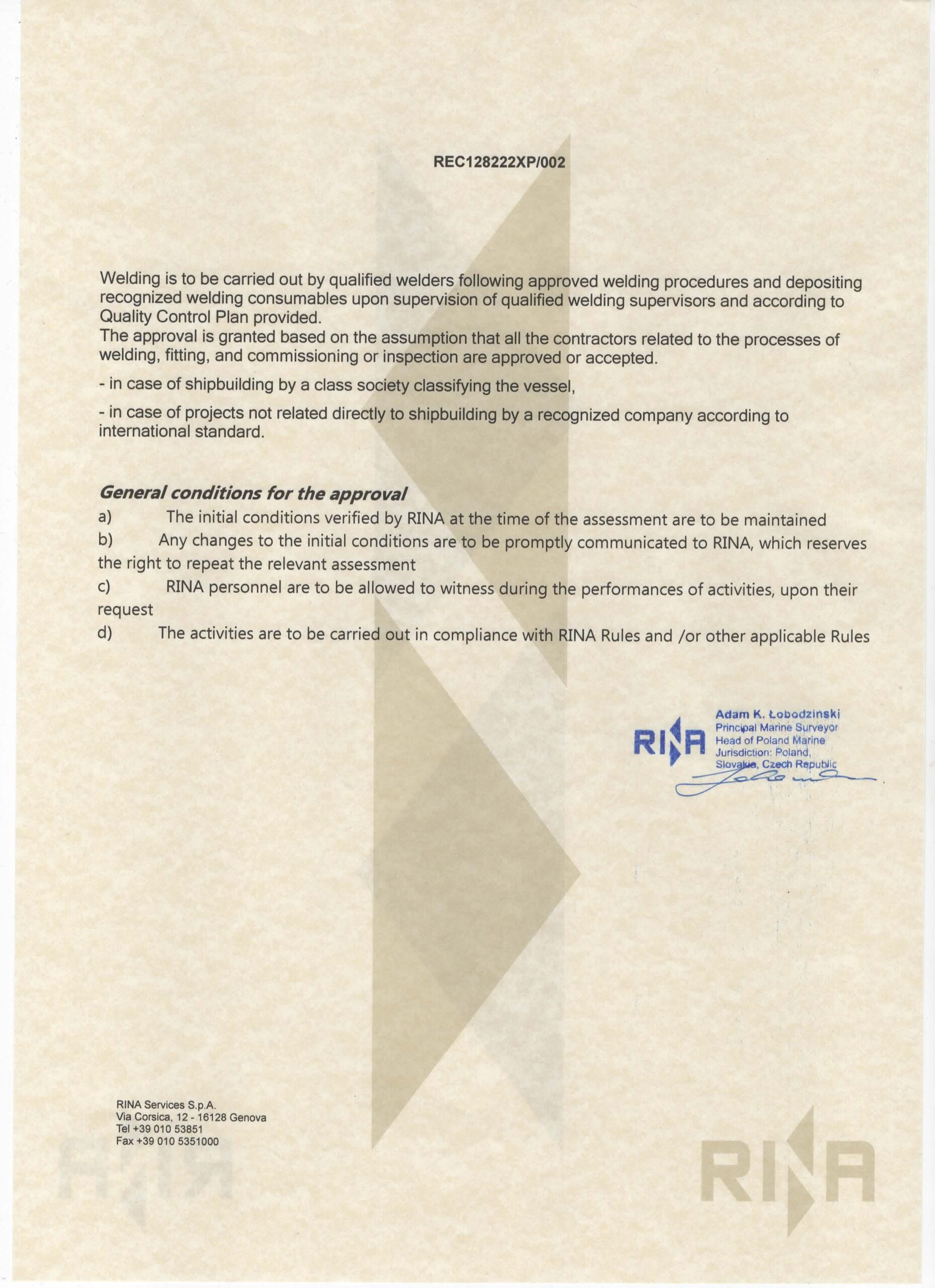 Certyfikacja RINA gwarantuje, że nasze procesy są zgodne z zatwierdzonymi procedurami oraz RINA Rules for the Classification of Ships, co zapewnia najwyższą jakość i bezpieczeństwo w budowie i konwersjach statków. Jesteśmy zobowiązani do utrzymywania najwyższych standardów, a nasze prace spawalnicze są wykonywane przez wykwalifikowanych spawaczy, pod nadzorem doświadczonych kierowników spawalnictwa, zgodnie z zatwierdzonymi procedurami i planem kontroli jakości.