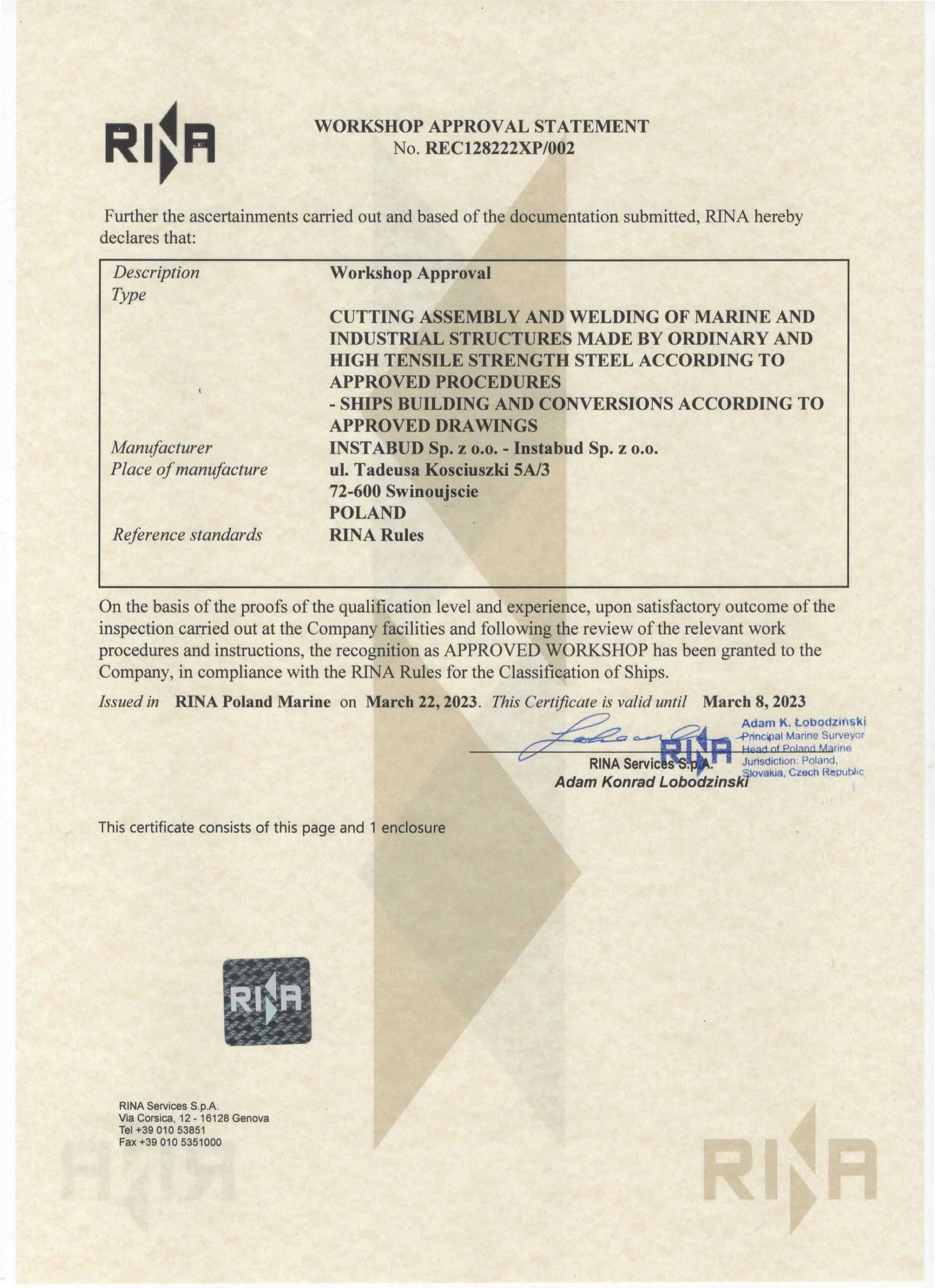 Z dumą informujemy, że INSTABUD Sp. z o.o. posiada certyfikat APPROVED WORKSHOP wydany przez RINA Services S.p.A. Ten prestiżowy certyfikat potwierdza nasze wysokie kwalifikacje i doświadczenie w zakresie cięcia, montażu i spawania konstrukcji morskich oraz przemysłowych wykonanych ze stali zwykłej i o wysokiej wytrzymałości.